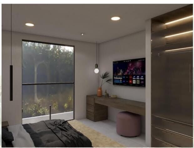 La recamara siempre será el sitio de descanso y confort personal de cada individuo. En la propuesta se propuso manejar colores neutros, closets de madera, y variedad de lamparas colgantes para luces cortesía.