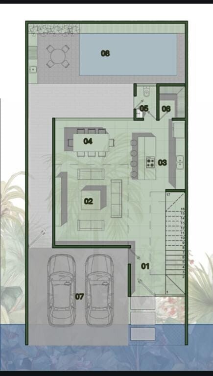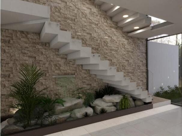 La escalera es el primer sitio con el que el usuario se encontrara una vez ingresado. La intención, es de recibir con una calidad y natural vista, por lo tanto, se aprovecha de manera estratégica la zona de la escalera, generando un jardín natural llena de piedras y vegetación, que incrustada en el muro de piedra.